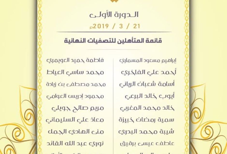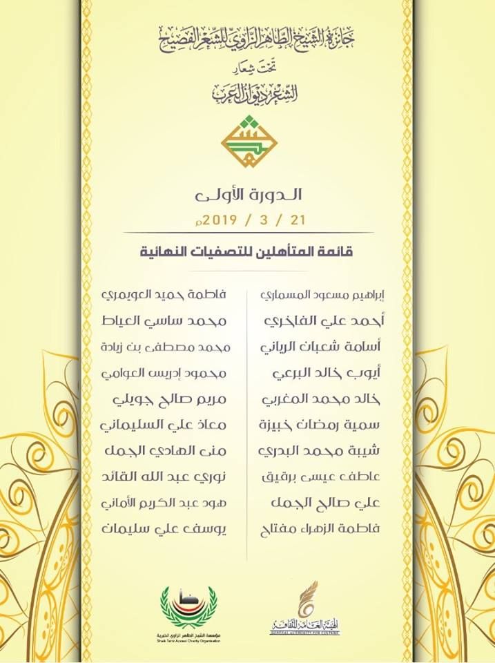 يسر اللجنة التحضرية لجائزة الشيخ الطاهر الزاوي الخيرية أن تعلن عن قائمة المتأهلين للتصفيات النهائية لجائزة الشيخ الطاهر الزاوي للشعر الفصيح الدورة الأولى.