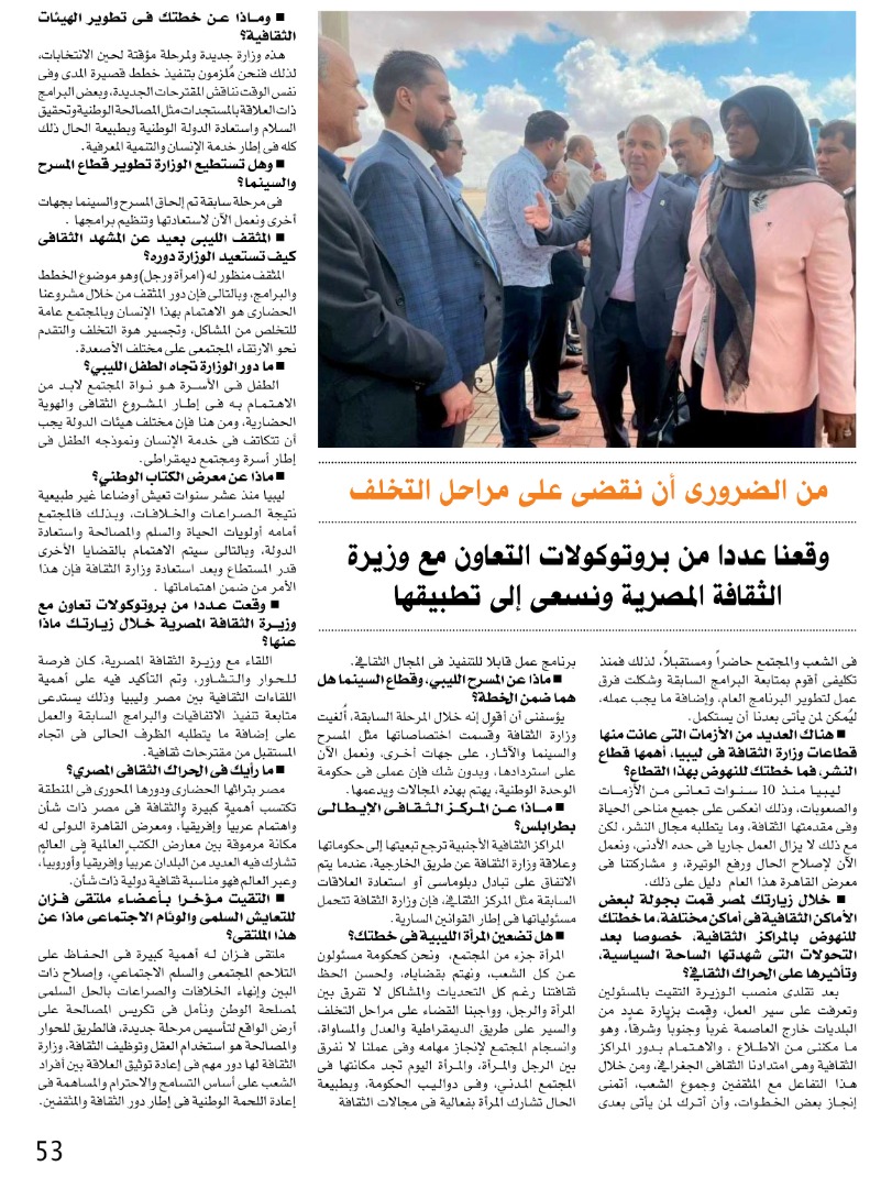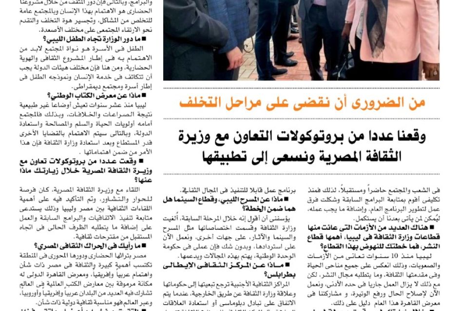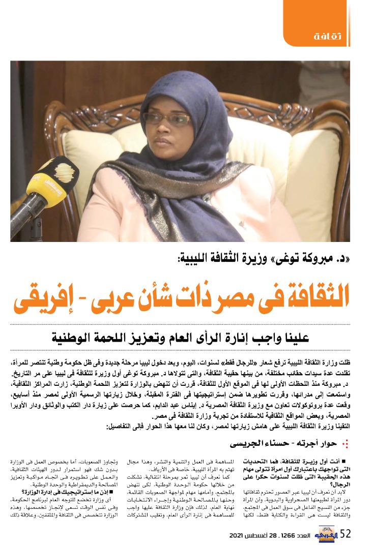 أجرت مجلة الأهرام العربي، لقاءً صحفياً مطولاً مع وزيرة الثقافة والتنمية المعرفية، الأستاذة مبروكة توغي، في عددها “1266” الصادر في الثامن والعشرين من أغسطس .