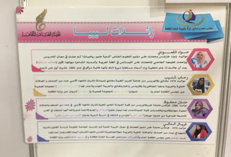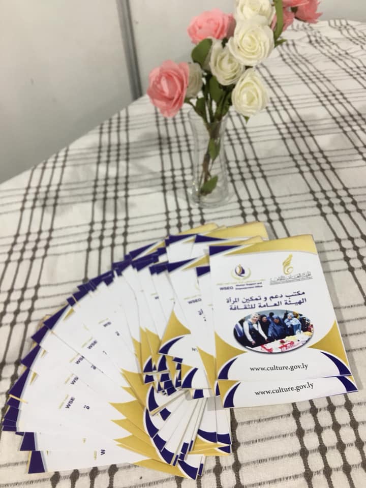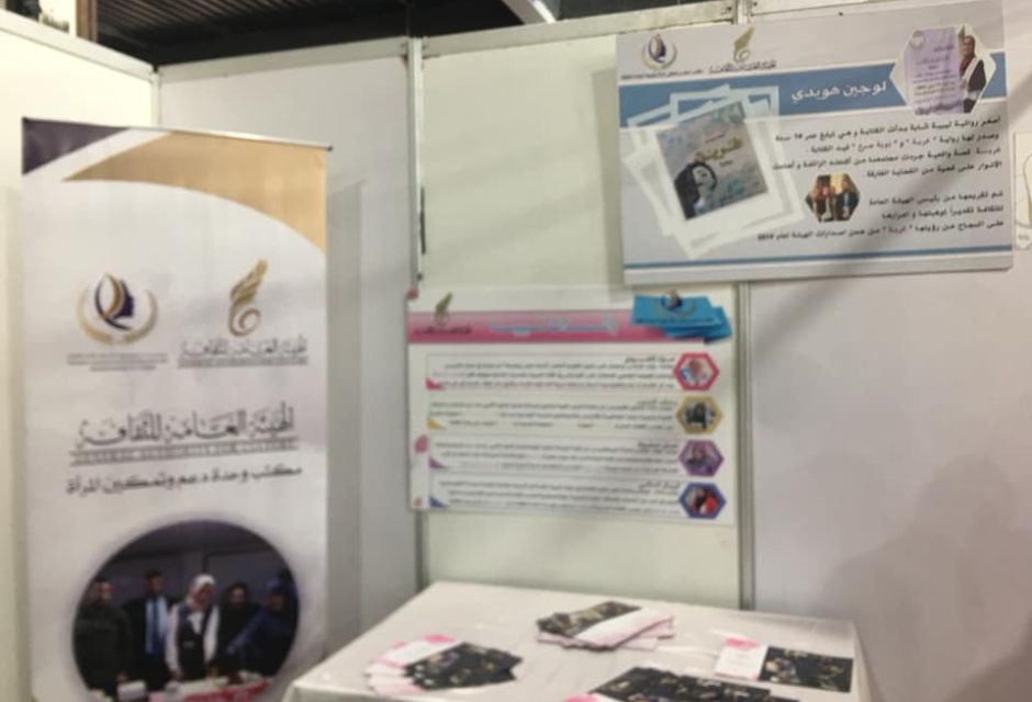 على أرض معرض مصراتة الدولي شارك مكتب دعم وتمكين المرأة بالهيئة العامة للثقافة في معرض الكتاب الوطني في دورته الثانية 2019 م. بجناح أشرفت عليه السيدة مها صقر مديرة المكتب شمل إبراز للتعريف بالمكتب وخصائصه ورسالته ورؤيته في المجتمع ودوره المنوط به من خلال التواصل مع مؤسسات المجتمع المدني والقيام بالمحاضرات التوعوية والتنموية من أجل خلق بيئة ومناخ لإمرأة مثقفة واعية قادرة على بناء أجيال المستقبل.