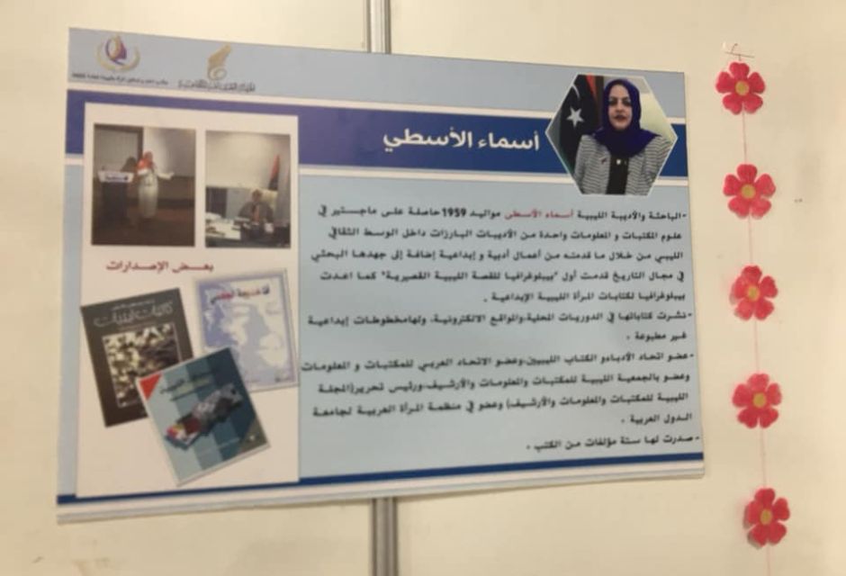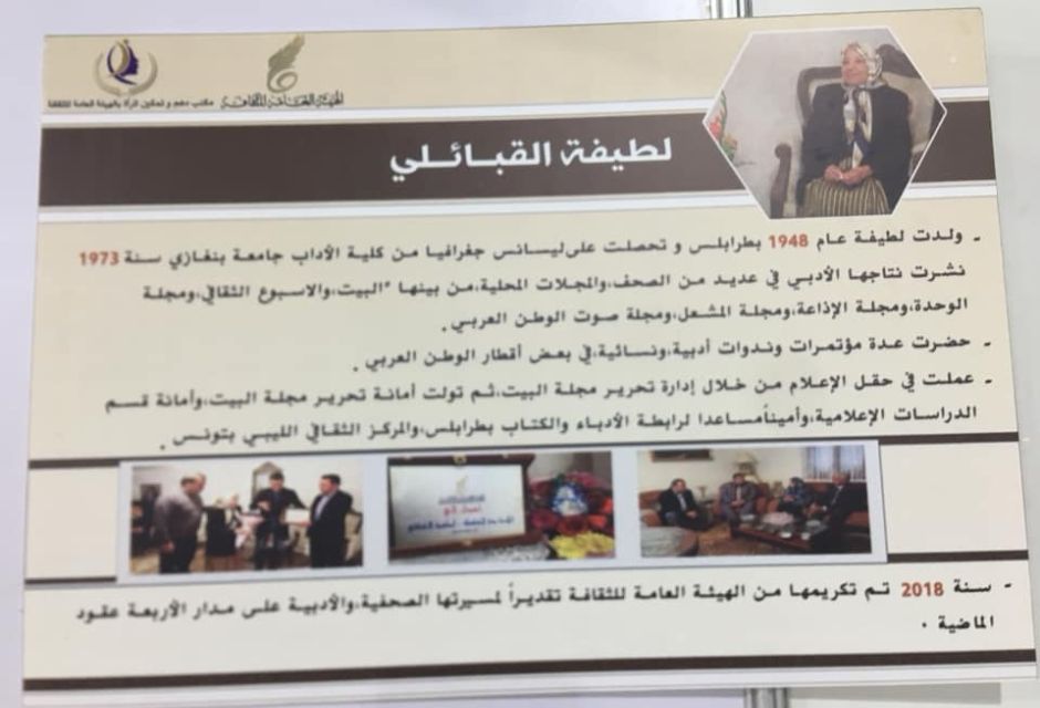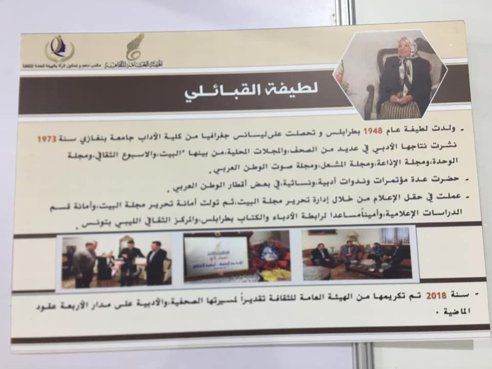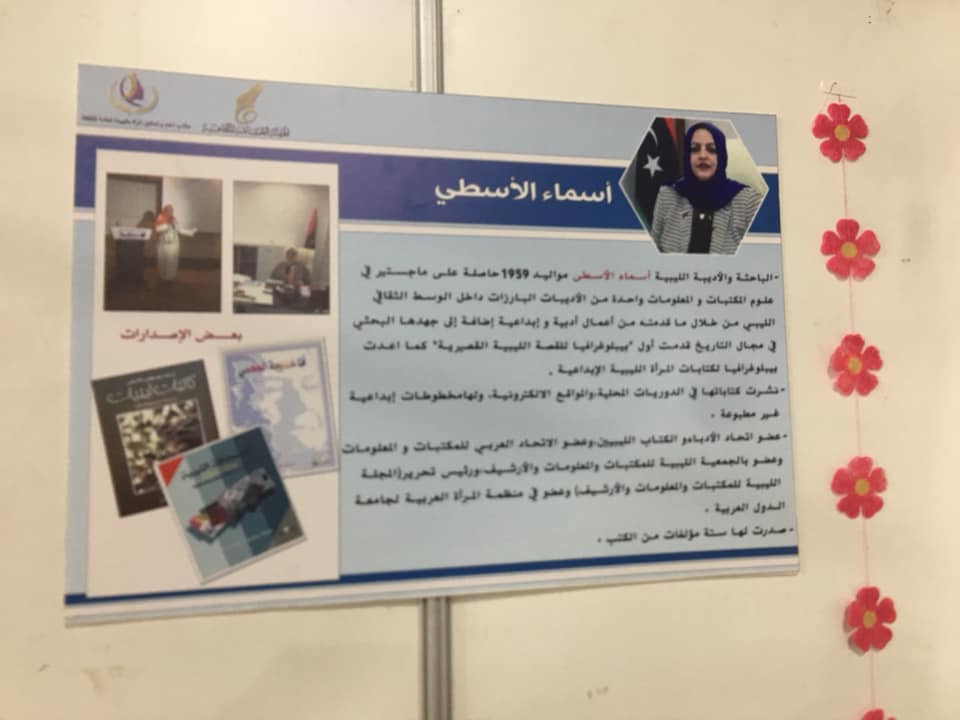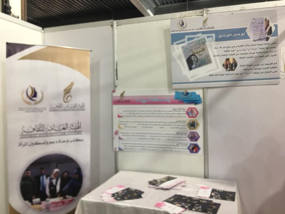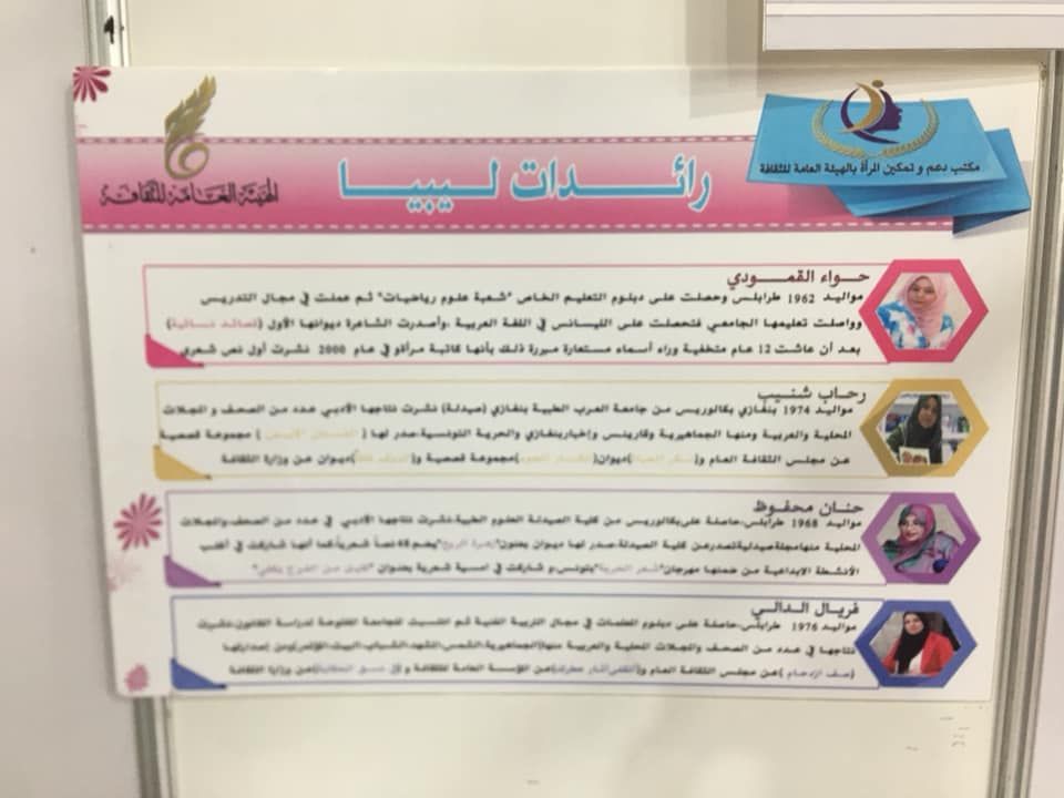 وعرض بالجناح منشورات من الكتب في الأدب والثقافة لعدد من الرائدات الليبيات كما قدمت الأستاذة مها صقر في عرضها للزوار نموذجا لأهم الرائدات الليبيات مثل الأديبة الدكتورة لطفية القبائلي التي كرمتها الهيئة العامة للثقافة ممثلة في رئيسها السيد حسن اونيس العام الماضي 2018م. مع أصغر كاتبة في السن لوجين هويدي عن روايتها غربة.