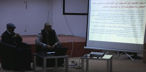 وتناول الأستاذ إبراهيم هدية ورقة حول العزوف عن السلم الآثار المترتبة على النزاعات الداخلية والخارجية على الدولة وذلك حسب الدراسات التي أشتغلت على هذه الموضوعية وأثار هذه النزاعات على أسباب العزوف عن التسجيل في الإنتخابات واستمرار دعوة البعض للإحتكام للسلاح أو العصيان المدني .