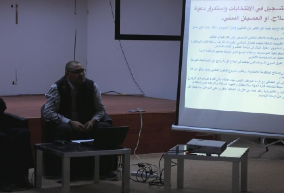 كما تناول الأستاذ محمد الككلي العديد من الأسئلة حول الانتخابات وحول الدستور وطرح هذه الأراء للنقاش من خلال المحاور المعروضة في الندوة.