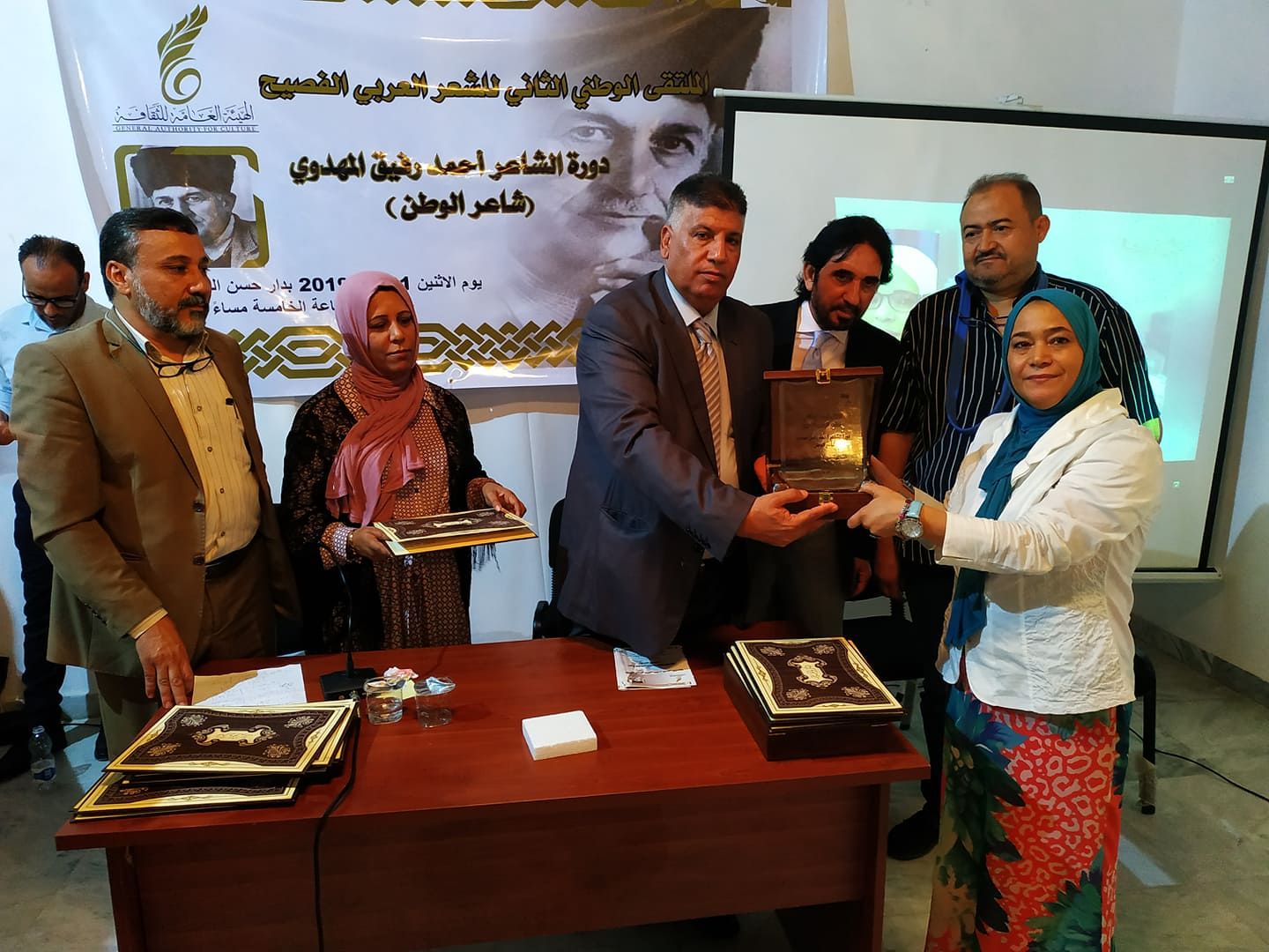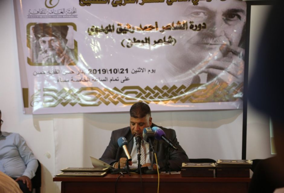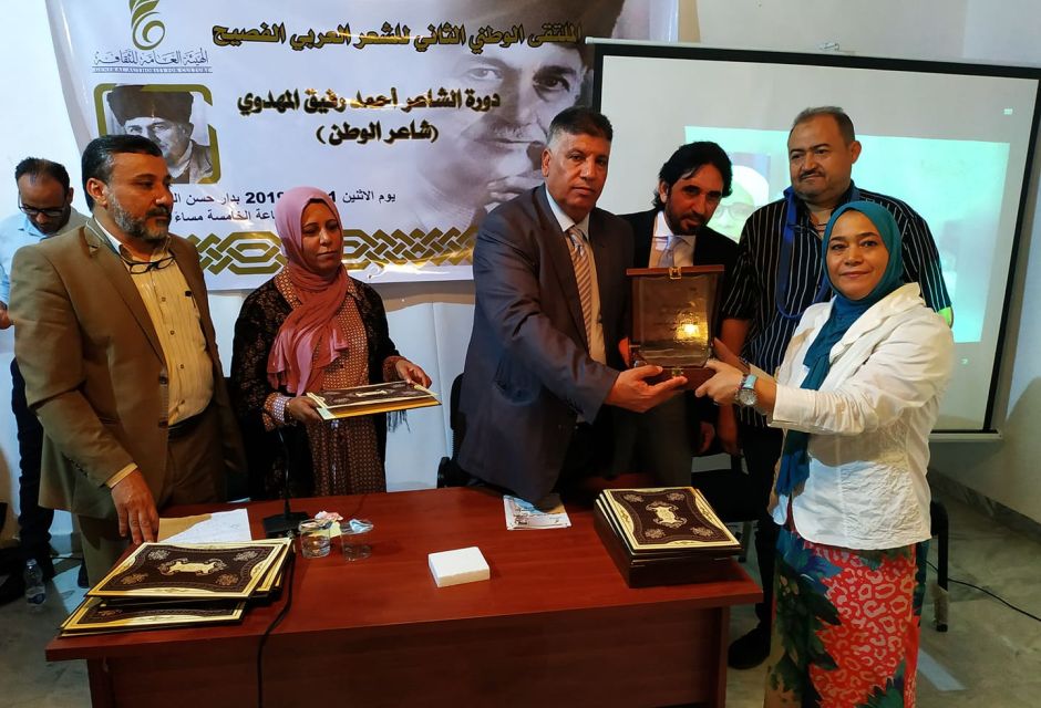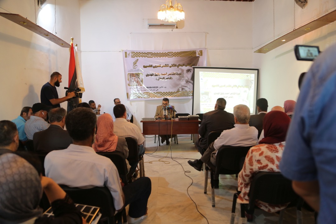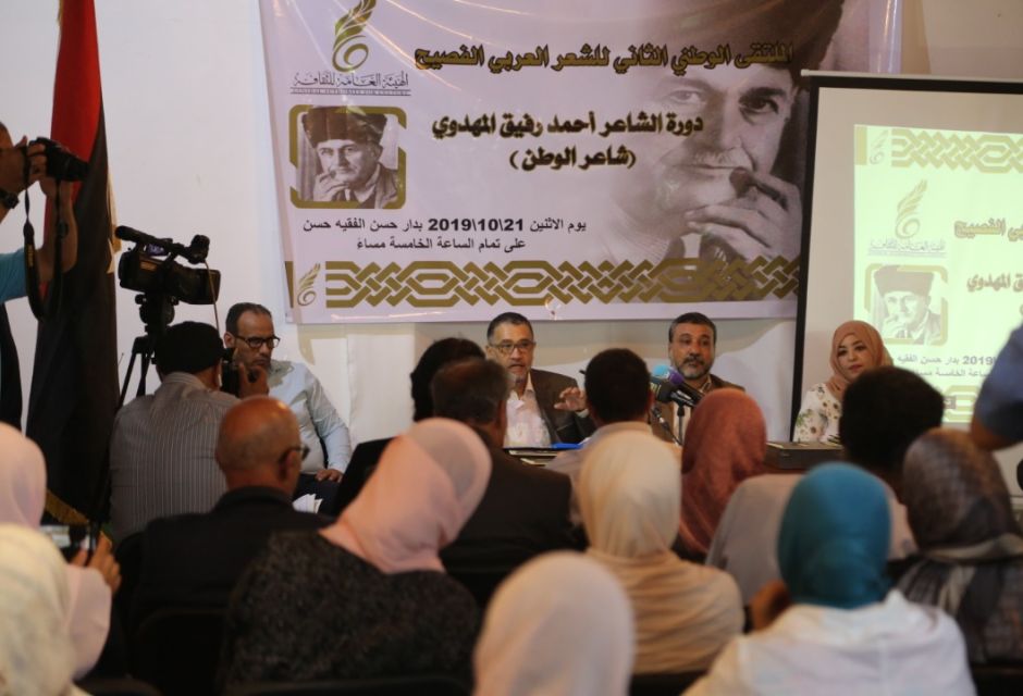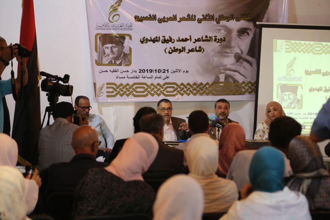 نظمت الهيئة العامة للثقافة الملتقى الوطني الثاني للشعر العربي الفصيح” دورة شاعر الوطن أحمد رفيق المهدوي”، وذلك مساء يوم الاثنين 21 أكتوبر 2019، بدار حسن الفقيه حسن بطرابلس، بحضور نخبة من المثقفين والأدباء والإعلاميين. اختارت الهيئة العامة للثقافة اسم الشاعر الليبي الكبير أحمد رفيق المهدوي عنواناً لهذا الملتقى كتقدير له لإبداعه في مجال الشعر، ولدوره الوطني البارز والمميز