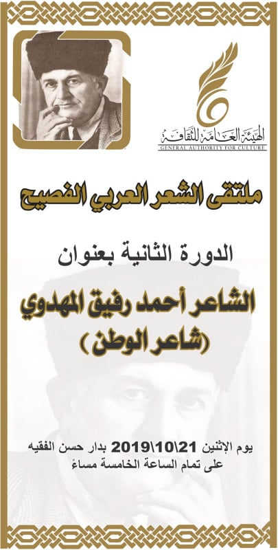 في نسخته الثانية ستنطلق مراسم الملتقى الوطني الثاني للشعر الفصيح دورة الشاعر أحمد رفيق المهدوي (شاعر الوطن) في يوم الاثنين القادم 21 أكتوبر209، بدار حسن الفقيه بالمدنية القديمة طرابلس عند الساعة الخامسة مساء.