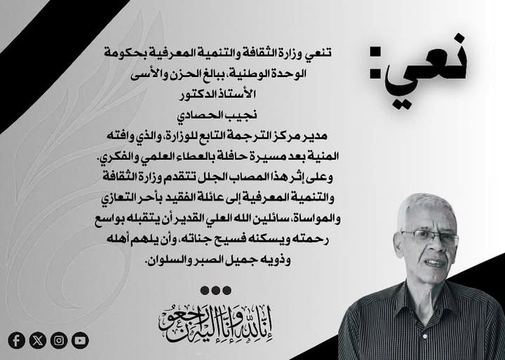 “بقلوب مؤمنة بقضاء الله وقدره، تنعى وزارة الثقافة والتنمية المعرفية الأستاذ الدكتور نجيب الحصادي، مدير المركز الوطني للترجمة التابع للوزارة، الذي وافاه الأجل المحتوم صباح اليوم الخميس عن عمر ناهز 72 عامًا بعد صراع مع مرض سرطان الرئة.
