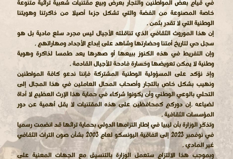 وتذكّر الوزارة بأن ليبيا في إطار التزامها الدولي بحماية تراثها قد انضمت رسميا في نوفمبر 2023 إلى اتفاقية اليونسكو لعام 2003 بشأن صون التراث الثقافي غير المادي .