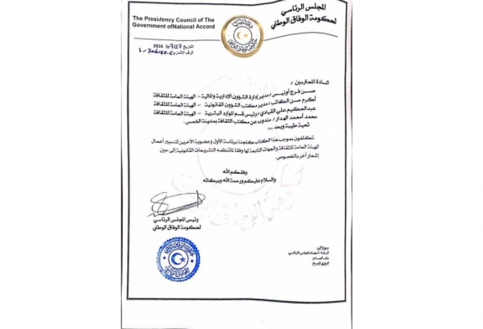 تكليف لجنة تسييرية لتسييرأعمال الهيئة العامة للثقافة والجهات التابعة لها من قبل المجلس الرئاسي لحكومة الوفاق الوطني