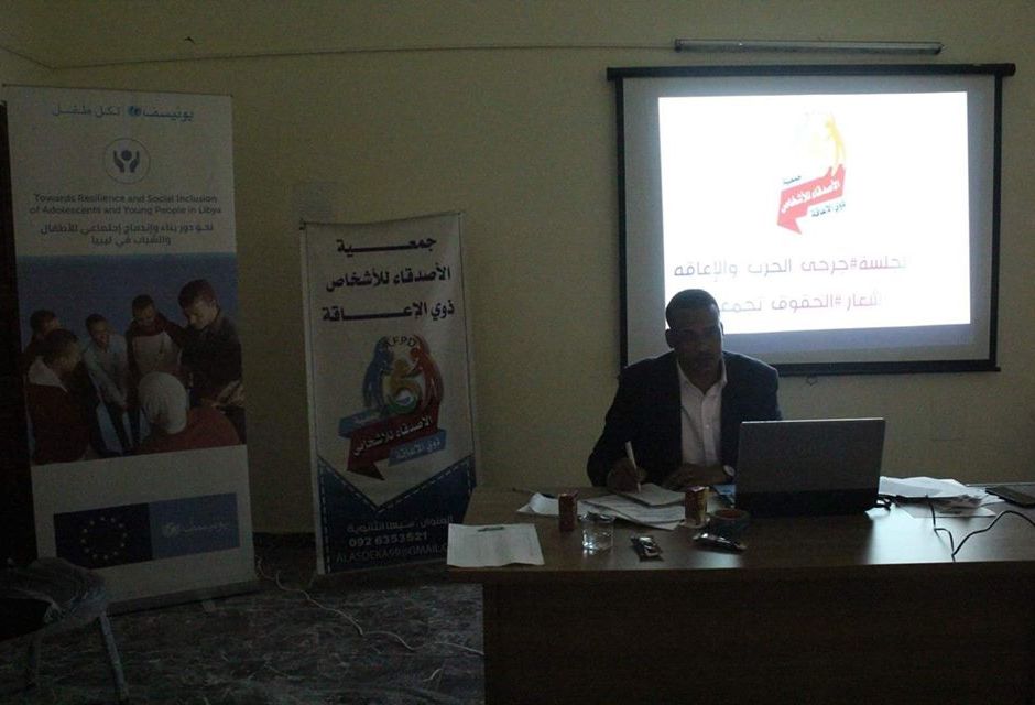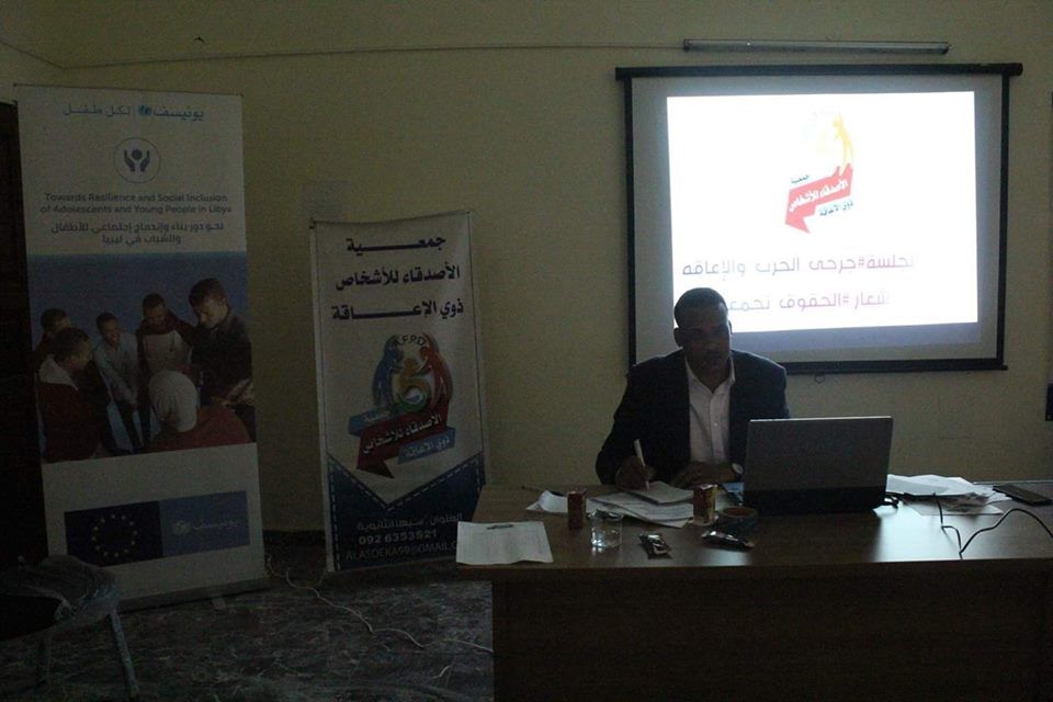 عقد صباح يوم الاثنين 4 مارس 2019، بقاعةالتدريب لبيت الثقافة سبها، جلسة حوارية عن جرحى الحرب والإعاقة لجمعية الأصدقاء لذوى الإعاقة.