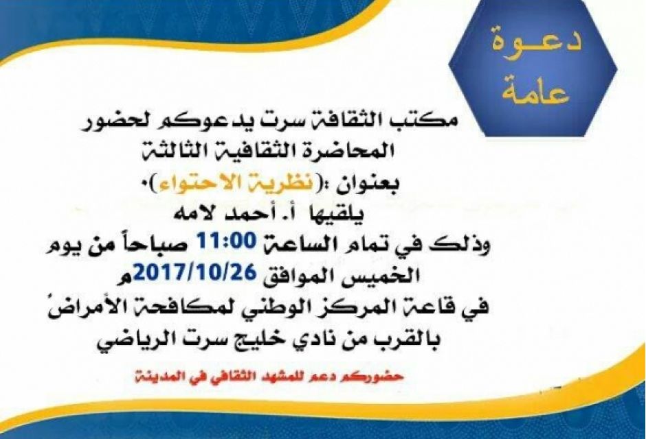 ينظم مكتب الثقافة سرت، محاضرة بعنوان: “نظرية الاحتواء” يلقيها