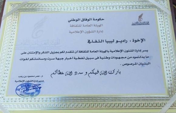 لما بذلوه من جهد لتغطية و نقل احداث معركة سرت و مساندتهم لقوات البنيان المرصوص .