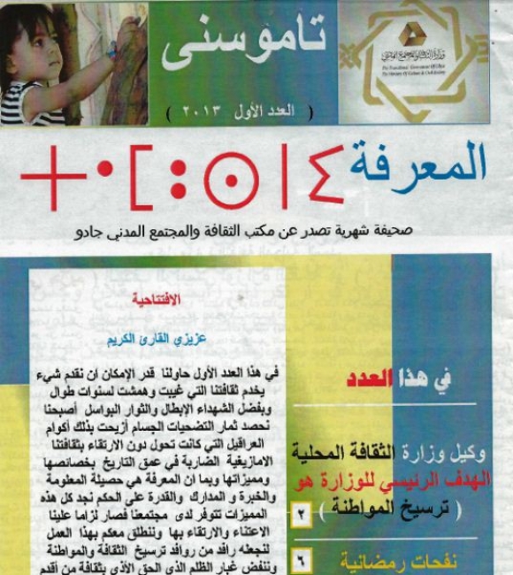 (خاص/ موقع وزارة الثقافة)- استقبلت المكتبات الليبية شهر يوليو 2013، العدد الأول من المجلة الأمازيغية الشهرية تاموسني (المعرفة) والتي تصدر عن مكتب الثقافة والمجتمع المدني بمدينة جادو.