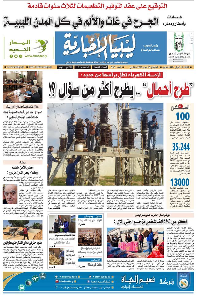 صدر اليوم الثلاثاء 18 يونيو2019، العدد 556 من صحيفة ليبيا الإخبارية الأسبوعية التي تصدر عن الهيئة العامة للثقافة، وتضمن العدد مواضيع مختلفة وبارزة، بالإضافة إلى أبواب الصحيفة الثابتة التي تتناول الأخبار والنشاطات الثقافية والمتابعات واللقاءات والتحقيقات معززاً بآراء أبرز الكتاب والصحفيين الليبيين .