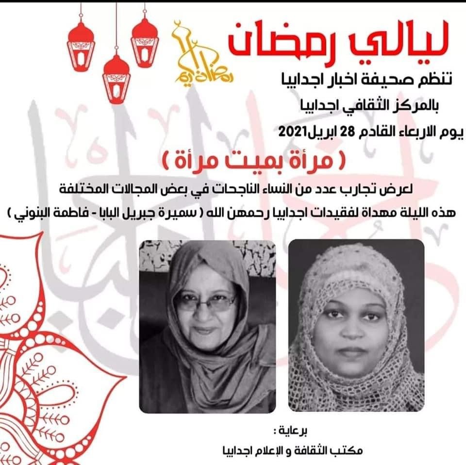 كما أقيمت جلسة ثانية بالمركز الثقافي كثاني بعنوان ” إمرأة بمئة مرأة ” حيث تم فيها عرض لتجارب عدد من النساء بالمدينة الناجحات في بعض المجالات المختلفة .. وكانت هذه الجلسة مهدات لفقيدات اجدابيا المتميزات مثل سميرة جبريل البابا وفاطمة البنوني رحمهما الله .