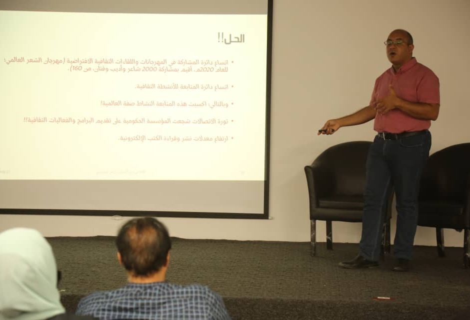 كذلك كيفية الاتصال وعدم التواصل خلال الجائحة والذي يتم عن طريق منصات التواصل الشبكي من خلال معارض الكتب والمهرجانات والأمسيات مشيرا إلى أن الحظر قد  ساهم في ارتفاع وتيرة الأنشطة المقامة وزيادة نسبة المشاهدة واتساع دائرة المشاركة في المهرجانات واللقاءات الثقافية الافتراضية