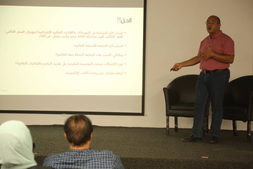 تناولت المحاضرة العمل الثقافي خلال فترة الحظر والعزل نتيجة جائحة فيروس كورونا المستجد (كوفيد 19)،
