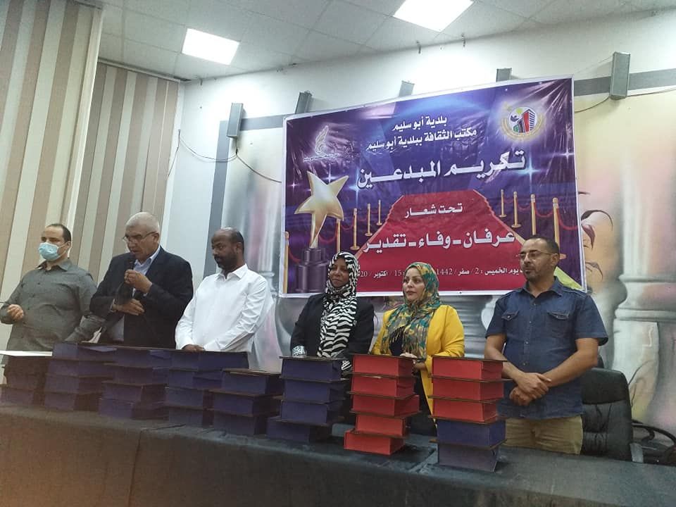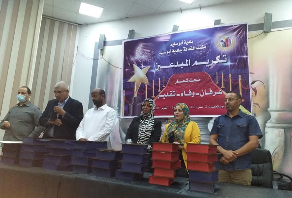 نظّم مكتب الثقافة ابوسليم بالتعاون مع بلدية أبوسليم في مسرح مبنى البلدية يوم أمس 15 أكتوبر2020، حفل تكريم الفنانين الراحلين خلال العامين الماضيين، وتكريم المتقاعدين بمكاتب الثقافة طرابلس، تحت شعار ” عرفان، وفاء، تقدير”، بحضور وكيل ديوان بلدية ابوسليم، و السيد عبد المنعم المريمي مدير مكتب الثقافة أبوسليم ، والسيدة انتصارعبود مدير مكتب الثقافة عين زارة، ومدير مكتب الثقافة سوق الجمعة السيد محمد الجطلاوي، ومدير مكتب التنمية الثقافية بالهيئة العامة للثقافة الأستاذة ماجدة العالم، ومدير قسم الموسيقى بالإذاعة الوطنية، وعدد من الفنانين والمثقفين.