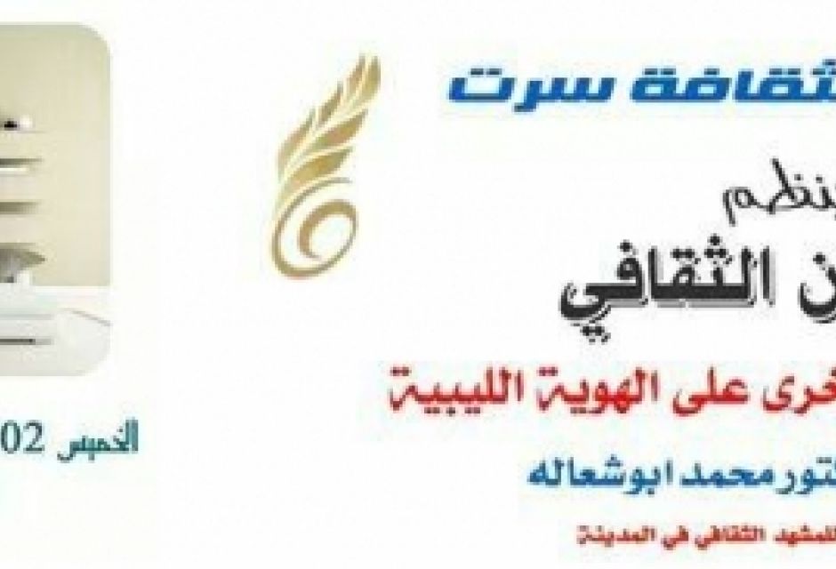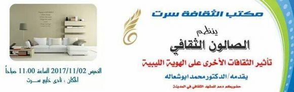 ينظم مكتب الثقافة سرت، الصالون الثقافي الثاني له بعنوان ” تأثير الثقافات الأخرى على الهوية الليبية “. يُحاضر في الصالون الدكتور محمد ابوشعاله، وذلك يوم الخميس الموافق 2 نوفمبر