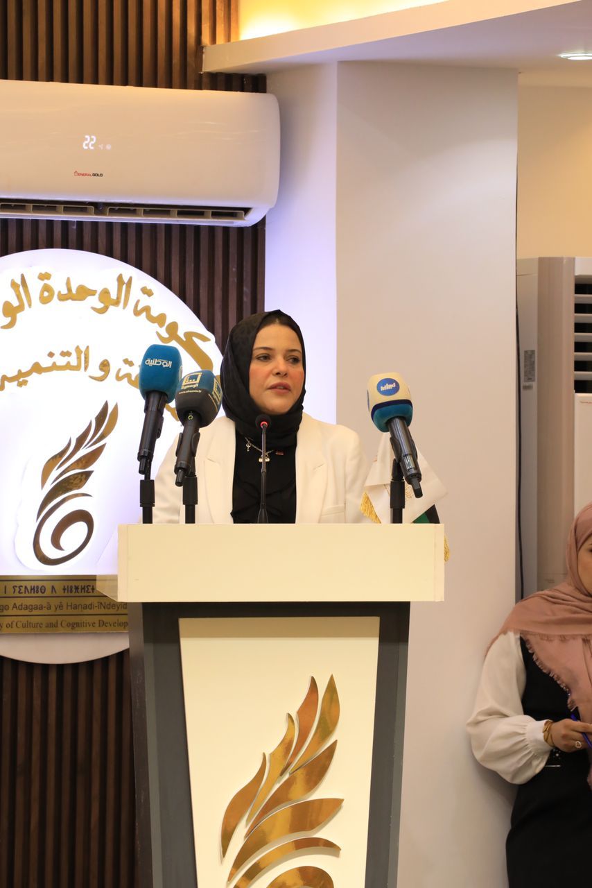 وقالت وزيرة الدولة لشؤون المرأة الأستاذة حورية الطرمال في كلمتها انني أقف أمامكم اليوم في هذه المناسبة العظيمة لنحتقل بتاريخ المرأة الافريقية وتضحياتها الجسمية ولنتأمل في مساهمات المرأة الافريقية التي تركت بصماتها العميقة في تاريخ قارتنا العزيزة