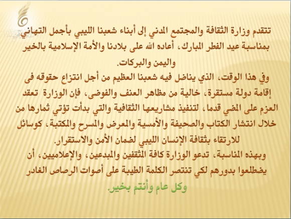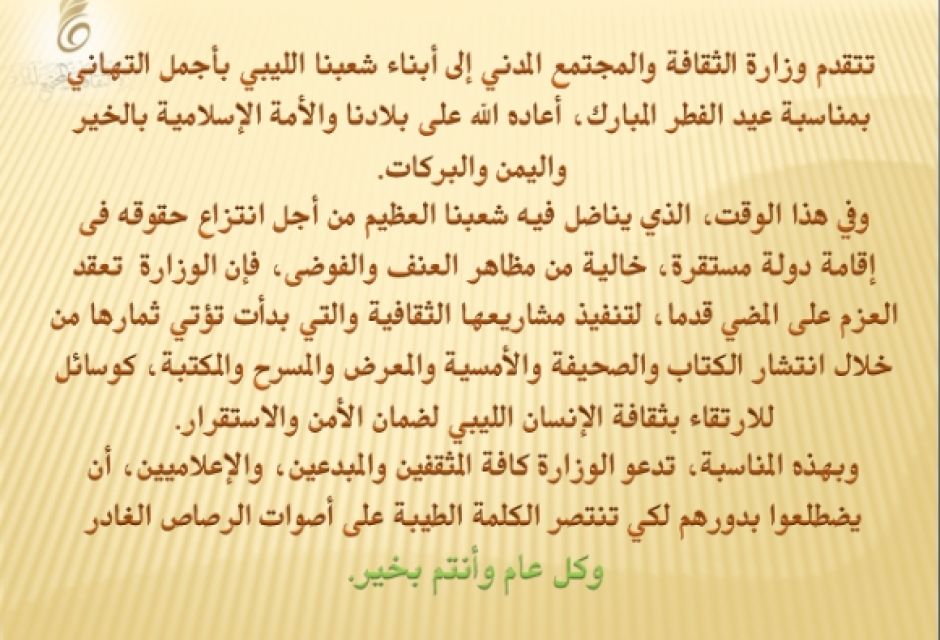 تتقدم وزارة الثقافة والمجتمع المدني إلى أبناء شعبنا الليبي بأجمل التهاني بمناسبة عيد الفطر المبارك، أعاده الله على بلادنا والأمة الإسلامية بالخير واليمن والبركات.