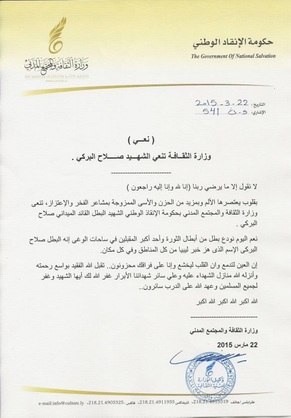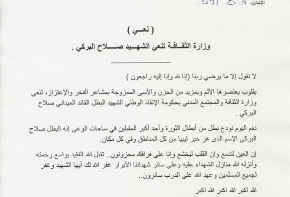 وزارة الثقــافـة تنعي الشهـــيد صـــــلاح البركي .