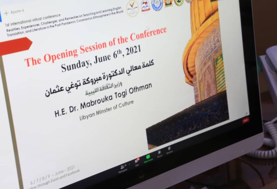 شاركت وزيرة الثقافة والتنمية المعرفية الأستاذة مبروكة توغي عثمان، مساء اليوم الأحد 6 يونيو2021، عبر وسائل التواصل المرئية، في المؤتمر العالمي الأول عن بُعد حول واقع وتحديات تعليم اللغة الانجليزية في مرحلة ما بعد تفشي فيروس كورونا، يتناول المؤتمر العلمي تعليم وتعلم اللغة الإنجليزية والترجمة والأدب في زمن كورونا