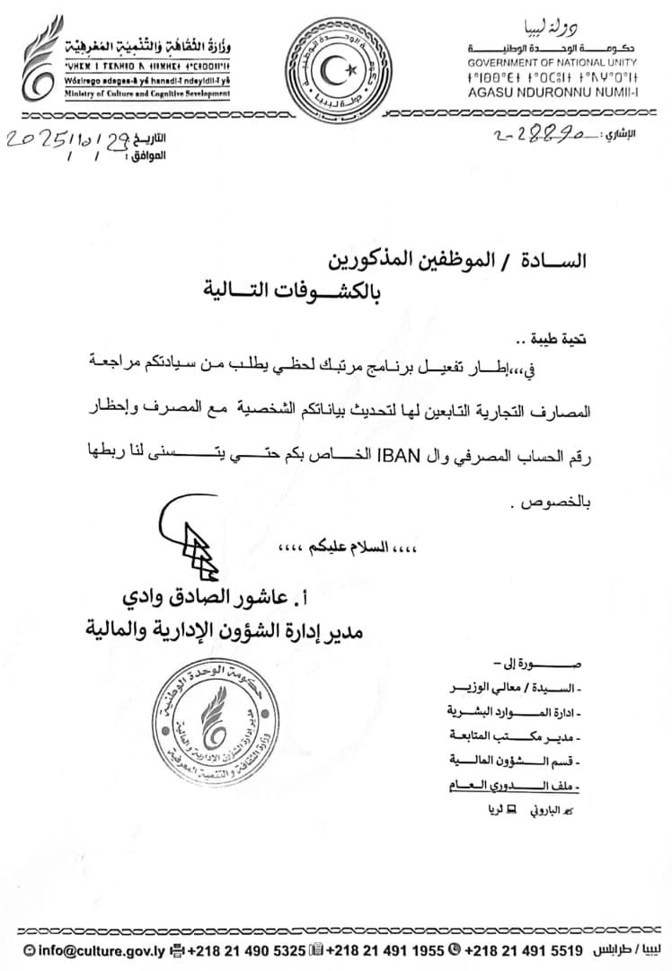 تعلم إدارة الشؤون الإدارية والمالية بوزارة الثقافة والتنمية المعرفية السادةَ موظفي ديوان الوزارة الواردة أسماؤهم في الكشف المرفق بضرورة مراجعة المصارف التي يتعاملون معها لاستكمال تحديث بياناتهم المصرفية، والتأكد من صحة رقم الحساب ورقم الـ IBAN.